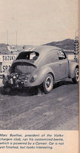 Racing at Carlsbad Raceway (DKP drag day). With a stock Porsche transmission that had way too tall gears, it was turning 14.80. It sure sounded mean ....just needed shorter gears. I had a front hood with a small "scoop" that housed 3 gauges. |